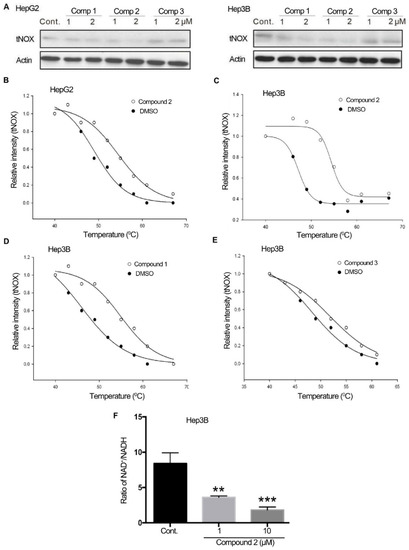Effects of selected derivatives on tNOX expression and CETSA-based determination of binding between those compounds and tNOX. (A) Cells were treated with different concentrations of compounds or vehicle for 24 h, and cell lysates were separated by SDS-PAGE and analyzed by Western blotting. (B–E) CETSA curves of tNOX in p53-wild-type HepG2 cells (B) and p53-deficient Hep3B cells (C,D,E) were determined in the absence and presence of different compounds, and cell lysates were separated by SDS-PAGE and analyzed by western blotting. β-Actin was used as an internal control. Representative images are shown. The band intensities of tNOX were normalized with respect to the intensity at 40 °C. The denaturation midpoints were determined using a standard process. (F) Derivative 2 dose-dependently reduces the NAD+/NADH ratio in Hep3B cells. Cells were treated with vehicle or compound 2, the NAD+ and NADH levels in cell extracts were quantified based on the optical density at 450 nm, and the NAD+/NADH ratio was calculated. Values (mean ± SEs) were obtained from at least three independent experiments.