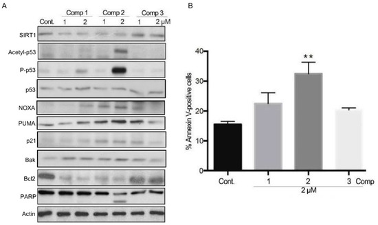 The effects of the selected derivatives on protein expression and apoptosis in HepG2 cells. (A) HepG2 cells were treated with different concentrations of compounds or vehicle for 24 h, and cell lysates were separated by SDS-PAGE and analyzed by western blotting. β-Actin was used as an internal control. Representative images are shown. (B) Cells were treated with different derivatives for 24 h, and the percentage of apoptotic cells was determined by flow cytometry. The presented values (mean ± SEs) represent as the percentage of cells in early and late apoptotic populations at least three independent experiments (** p < 0.01 for treated cells vs. controls). Representative images are shown.