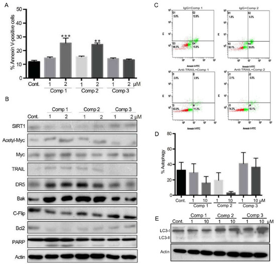 The effects of derivatives on protein expression and cell death in Hep3B cells. (A) Cells were treated with different derivatives for 24 h, and the percentage of apoptotic cells was determined by flow cytometry. H2O2 treatment was used as a positive control. The presented values (mean ± SEs) represent as the percentage of cells in early and late apoptotic populations at least three independent experiments (** p < 0.01, *** p < 0.001 for treated cells vs. controls). Representative images are shown. (B) Hep3B cells were treated with different concentrations of compounds or vehicle for 24 h, and cell lysates were separated by SDS-PAGE and analyzed by western blotting. β-Actin was used as an internal control. Representative images are shown. (C) Cells were pre-treated with IgG or TRAIL-neutralizing antibody at final concentration of 1 μL/mL for one h before exposed to different derivatives for 24 h. The percentage of apoptotic cells was determined by flow cytometry as described in A. (D) Cells were treated with different compounds or vehicle for 6 h. Autophagy was then determined by AO staining using flow cytometry, and the results are expressed as a percentage relative to the control group. Values (mean ± SEs) were obtained from three independent experiments. (E) Hep3B cells were treated with different concentrations of compounds or vehicle for 24 h, and cell lysates were separated by SDS-PAGE and analyzed by western blotting. β-Actin was used as an internal control. Representative images are shown.