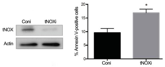 tNOX depletion enhances spontaneous apoptosis in Hep3B cells. tNOX was knocked down by RNA interference in p53-deficient Hep3B cells for 24 h, and the percentage of apoptotic cells was determined by flow cytometry. The presented values (mean ± SEs) represent at least three independent experiments (* p < 0.05 for tNOX-knockdown cells vs. controls). Representative images are shown.