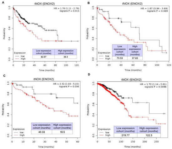 It has been well documented that tNOX positively regulates cell proliferation and migration [17,18,19,20,21], but much less is known regarding the expression and the related clinical outcomes. Previous work showed that anti-cancer drug treatments suppressed the tNOX activity observed in pooled sera of cancer patients but not non-cancer-bearing volunteers [52,53,54]. Using data mining in Kaplan-Meier plotter (www.kmplot.com), we herein observed that the overall survival in 370 patients with liver cancer tended to be correlated with tNOX expression, although not to a significant degree. The median overall survival in the low tNOX expression cohort was 61.73 months, compared to 46.2 months in the high tNOX expression cohort (HR: 1.37, log-rank p = 0.11). When we separated the patients by gender, we found that tNOX expression was significantly correlated with poor prognosis in male patients, but not in female patients (Figure 7A,B), suggesting that gender is a key factor that affects survival outcomes. This finding is not surprising, given that the tNOX gene resides on the X chromosome [13] and previous work showed that gender influences the survival of colorectal cancer patients [55,56]. Thus, the gender-related differences in clinical outcomes may reflect a dosage effect on genes expressed from sex chromosomes [57]. Using the online EMBL-EBI database (http://www.ebi.ac.uk/gxa), we found that tNOX (ENOX2) expression was 2 Log2-fold enhanced in specimens from primary colorectal tumor patients with and without distant metastasis, as assessed in a microarray analysis [58]. Interestingly, a previous study found that the use of hepatocyte growth factor to induce the epithelial-mesenchymal transition (EMT) was associated with significant induction of tNOX expression in small cell lung cancer cells [59]. This was consistent with our previous proposal that up-regulation of tNOX enhances cell migration and EMT [24]. tNOX expression has also been positively associated with lymphangiogenesis, and high-level tNOX-expression was found to be associated with very metastatic phenotypes in a population of melanoma patients [60]. These converging lines of evidence strongly suggest that tNOX must be suppressed in order for a patient to have a better prognosis.