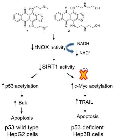 In the present study, we focused on the apoptotic pathways that are induced by selected novel anthraquinone derivatives in human hepatocellular carcinoma cells that differ in their p53 status. In p53-wild-type HepG2 cells, binding of the drug to tNOX was found to interfere with tNOX-NAD+-SIRT1 activation, leading to p53 acetylation/activation and apoptosis. In p53-deficient Hep3B cells, on the other hand, inhibition of the tNOX-NAD+-SIRT1 axis increased c-Myc acetylation, which up-regulated TRAIL and DR5 expression to induce apoptosis. Based on these findings, we proposed that targeting of tNOX may be a potential strategy for cancer therapy in both p53-dependent and -inactivated systems and the tested compounds can be explored further as therapeutics against cancer.