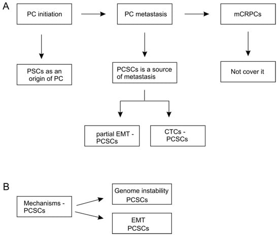 In addition to cancer initiation, CSCs are widely regarded to play a central role in cancer progression, particularly in metastasis and resistance to therapies; in terms of PC, evidence supports PCSCs being critical in PC metastasis (this review) and CRPC development []. Solid tumors are not only heterogeneous but also have extensive intratumor heterogeneity [,]. The proportion of cells with CSC properties increases with cancer progression []. In this regard, CSCs including PCSCSs are heterogeneous and regulated by complex mechanisms; at the center of these regulations is the possession of CSCs’ plasticity.