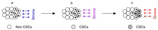 A dynamic model of cancer stem cells (CSCs). Intratumoral communications (black arrows with double directions) and tumor stromal communications (colored arrows with double directions) in (a) lead to the generation of CSCs (b). These communications will also drive CSC evolution (c).