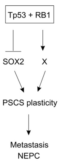 Genomic sequencing revealed a prevalence of mutations in TP53 (53.3%) and PTEN (40.7%) in mCRPCs [], suggesting an important interaction between these two tumor suppressors in suppressing the acquisition of a PCSC-like stage and/or the induction of the lineage plasticity of PCSCs during the progression of metastasis and CRPC. This concept is supported by the observations that PCs with the inactivation of both tumor suppressors are resistant to abiraterone and progress to neuroendocrine (NE) PC following abiraterone treatment in both mouse model and patients []. Loss of the TP53 and RB1 tumor suppressor genes are part of a signature event in NEPC development following anti-androgen treatment []. While PCs in prostate-specific PTEN−/− mice are not generally metastatic, the co-knockout of RB1 resulted in highly efficient (100%) metastasis to the lymph node, lung, and liver as well as bone (2/10) []. Triple knockout of PTEN, RB1, and TP53 substantially enhanced NEPC progression following castration; the gene expression profile of these mouse NEPCs shares a similar profile with human NEPCs []. These observations are consistent with the association of the triple tumor suppressors with PC plasticity [,]. Furthermore, the NEPC lineage plasticity was also resulted from human primary prostate epithelial cells when engineered with AKT activation, RB1 knockdown, the expression of dominant-negative p53, MYC, and BCL2 []. Collectively, these new developments reveal a critical role of the tumor suppressor genes TP53 and RB1 in suppressing PCSC reprogramming. This process resembles the induction of iPSCs (inducible pluripotent stem cells), which is associated with DNA damage and the inhibition of p53 facilitates reprogramming toward iPSC [].