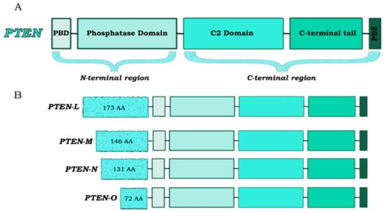 In addition, distinct functions of PTEN are associated with the extracellular environment through its secretion and export. Cellular non-autonomous effects of PTEN are mediated by two main mechanisms, direct (through the release from the cell of a membrane-permeable PTEN isoform (PTEN-L)) and indirect (through the release of PTEN into exosomes) [37]. PTEN-L is the most studied proteoform and is generated from a translational variant of PTEN mRNA. In addition, three other variants have been described (PTEN-M, PTEN-N and PTEN-O), but their role is yet to be elucidated [52]. The presence of a membrane-binding helix in these proteins could lead to their association with the membrane. Moreover, PTEN-L and PTEN-M could play a role in the nucleus and nucleolus due to a putative sequence of nuclear localization [53] (see Figure 1).