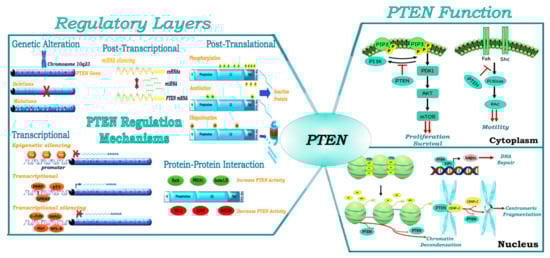 PTEN protein regulation and function. PTEN protein expression is regulated by genomic (mutation and deletions), transcriptional (epigenetic mechanisms and transcription factors), post-transcriptional (miRNAs, PTEN pseudogene), post-translational mechanisms (phosphorylation, acetylation, ubiquitination, etc.) and protein–protein interaction. PTEN performs multiple cellular functions, at least in part determined by its subcellular localization. In the cytoplasm, PTEN dephosphorylates PhosphatidylInositol-3,4,5-trisPhosphate (PIP3), decreasing PI3K activity and several proteins such as focal adhesion kinase (FAK) or Src-Homology/Collagen (SHC), to regulate different signal networks. The nuclear PTEN activities include the regulation of genomic stability, gene expression, DNA repair mechanisms and centromeric stability.