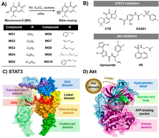 Two-dimensional (2D) chemical structures of (A) MG and its semi-synthetic ether derivatives MG1-MG10 [30] and (B) the known STAT3 (cryptotanshinone (CST) and S3I201) and Akt (uprosertib and H8) inhibitors. Three-dimensional (3D) structures of (C) STAT3 and (D) Akt1 signaling proteins. The SH2 domain of STAT3 and the ATP-binding pocket of Akt are shown by blue surface and black circle, respectively.