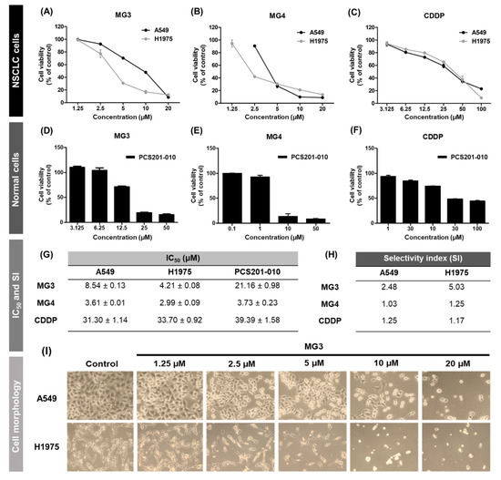 Cell viability of NSCLC (A–C) and PCS201-010 (D–F) cell lines after treatment with MG3, MG4, and CDDP for 48 h. The IC50 (μM) and SI of three focused compounds against all studied cell lines are shown in (G) and (H), respectively. (I) The morphological changes of two NSCLC cell lines treated with MG3 at various concentrations for 48 h.