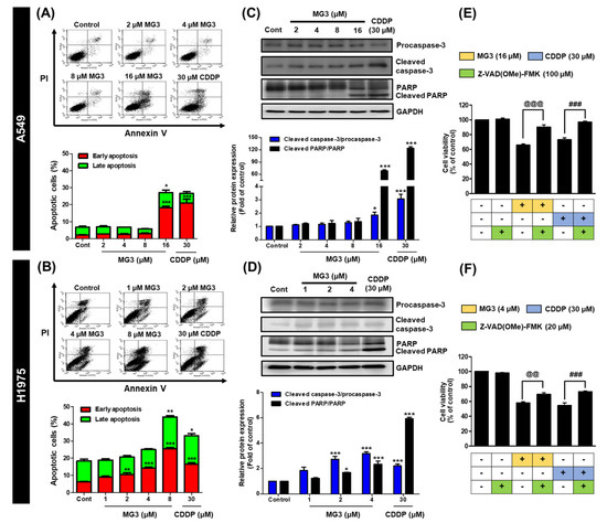 Flow cytometric analysis of Annexin V/PI stained cells after MG3 and CDDP treatments for 24 h on (A) A549 and (B) H1975 cells. Western blot analysis of apoptotic markers, caspase-3 and PARP, for (C) A549 and (D) H1975 cells. Inhibition of MG3-induced apoptosis by the pan caspase inhibitor Z-VAD(OMe)-FMK in (E) A549 and (F) H1975 cells. Data are expressed as mean ± SEM (n = 3). * p ≤ 0.05, ** p ≤ 0.01, and *** p ≤ 0.001 vs. control. @ p ≤ 0.05, @@ p ≤ 0.01, and @@@ p ≤ 0.001 vs. MG3. # p ≤ 0.05, ## p ≤ 0.01, and ### p ≤ 0.001 vs. CDDP.
