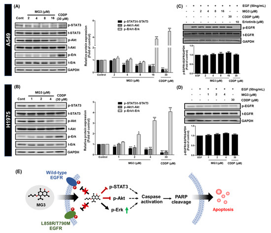 MG3 dose-dependently inhibits the phosphorylation of STAT3 (Tyr705) and Akt (Ser473) in (A) A549 and (B) H1975 cells at 24 h. The expression of p-Erk (Thr202/Tyr204) is found to be increased upon MG3 and CDDP treatments. The phosphorylation of EGFR (Y1068) for both (C) A549 and (D) H1975 cells is not significantly affected by MG3 and CDDP treatments. (E) Proposed mechanisms of MG3 against two studied NSCLC cell lines, in which MG3 promotes cell apoptosis through the inhibition of p-Akt and p-STAT3 as well as through the activation of MAPK signaling pathway. Data are expressed as mean ± SEM of three independent experiments. * p ≤ 0.05, ** p ≤ 0.01, and *** p ≤ 0.001 vs. control.