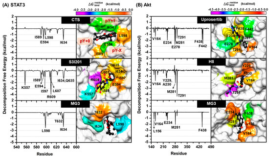 (kcal/mol) of (A) STAT3 and (B) Akt. The amino acids involved in ligand binding are shaded according to their , in which the highest and lowest energies are ranged from red to magenta, respectively.