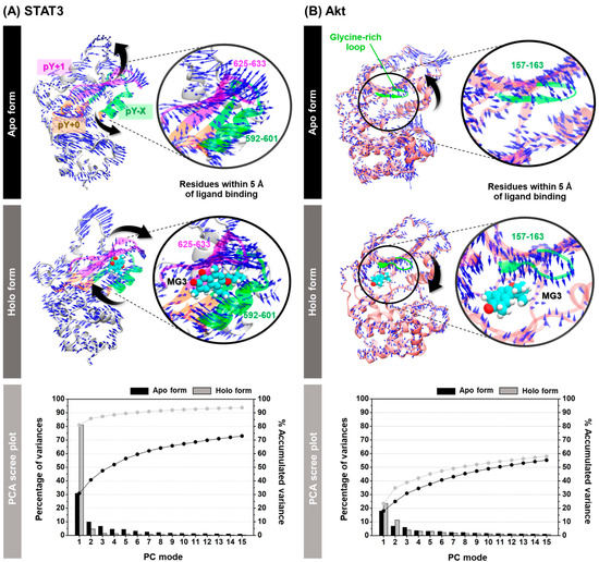 By considering STAT3 model (Figure 6A), the first principal component (PC1) showed that MG3 binding importantly converted the direction of motions of overall protein to approach the ligand in a different manner from that of the apo form. Remarkably, the residues 592–601 on pY − X (green) and 625–633 on pY + 1 (magenta) hydrophobic pockets of STAT3 SH2 domain displayed not only increased direction of motions, but also enhanced amplitude of motions upon MG3 binding mainly through vdW interaction (Table 2). For the Akt systems (Figure 6B), the residues 157–163 on glycine-rich loop (GRL, green) inside the ATP-binding pocket of apo form pointed outward from the binding site, making it an opened conformation. Intriguingly, a complexation with MG3 led to the conversion of direction of GRL motion to be located closer to the MG3 molecule, resulting in a closed conformation.