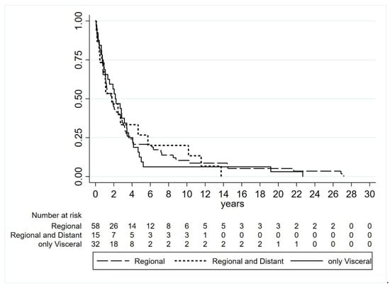 Metastases included in the study appeared after median follow-up of 1.9 years from primary melanoma diagnosis (0.7–3.8). Fifty-eight patients developed regional metastases only (24 skin, 29 lymph nodes, and five skin and lymph nodes), 15 had concomitant regional and distant metastases and 32 exhibited visceral metastases as first and unique sites of relapse. In detail, among the latter with visceral metastases, 19 patients had a single site of involvement (eight lung, seven brain, two liver, one spleen and one peritoneum), nine patients exhibited two metastatic sites and four patients had more than two sites involved. The visceral pattern of relapse seems to be related to the trunk site of primary melanoma but not with NM histotype. No differences in median time to relapse were observed to be associated with the site of disease relapse (log-rank test p = 0.9564) (Table 1, Figure 1).