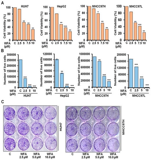 Previous study from our lab showed the growth-inhibitory and pro-apoptotic effects of WFA in HepG2 and Huh7 cells [28]. Evaluation of anti-proliferative efficacy of WFA on multiple HCC cells showed that WFA treatment significantly decreased the anchorage-dependent cell viability of multiple HCC cells in a dose-dependent manner, with an IC50 of 5 µM in Huh7, HepG2 and MHCC97L cells; and 7.5 µM in MHCC97H cells, respectively (Figure 1A). Trypan blue dye exclusion assay revealed a five-fold and two-fold reduction in Huh7 and HepG2 viable cells, respectively, with 2.5 µM WFA treatment (Figure 1B). However, more than a three-fold reduction in MHCC97H and MHCC97L viable cells was observed with 5 µM WFA treatment (Figure 1B). To thrive under unfavorable conditions, cancer cells possess clonogenic potential, which aids their survival as colonies of cells. To analyze the anti-colony forming ability of WFA in HCC cells, we performed a clonogenic cell survival assay upon WFA treatment. Both Huh7 and MHCC97H cells revealed more than a 70% decrease in colony-forming ability upon WFA treatment. Together, these results present the anti-proliferative and anti-clonogenic ability of WFA against HCC cells.
