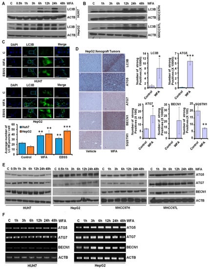 Immunofluorescence analyses of WFA treated HCC cells demonstrated the presence of a significantly higher number of autophagic vacuoles, marked with LC3B puncta compared to vehicle treated control cells (Figure 2C). These in vitro observations were also corroborated using in vivo HCC tumors from an HCC-xenograft assay. Indeed, immunohistochemical analysis revealed elevated expression of LC3B, ATG5, ATG7 and BECN1 with decreased expression of SQSTM1 in HepG2 xenografts from WFA-treated mice in comparison to vehicle treated mice (Figure 2D). Autophagic process is orchestrated by various autophagy-related proteins that mediate the formation of an initiation complex, phagophore initiation and elongation, autophagosome formation, and fusion of autophagosomes with lysosomes [34]. WFA treated HCC cells showed increased expression of autophagy related proteins, such as, ATG5, ATG7 and BECN1 (Figure 2E). Increased mRNA expression of ATG5, ATG7 and Beclin1 was also observed in HCC cells upon WFA treatment (Figure 2F). Collectively, these data show that WFA augments autophagy in HCC.