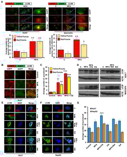 It is known that increased levels of LC3B-II upon a drug treatment can be observed either due to increased synthesis of autophagosomes or due to the decreased turnover of autophagosomes because of slower trafficking to the lysosomes [35]. To examine whether WFA induces autophagosomes in HCC cells, we transfected Huh7 and MHCC97H cells with mRFP-EGFP-LC3B, a tandem fluorescent-tagged LC3B plasmid that can identify autophagosomes (GFP-positive and RFP-positive merged as yellow) and autophagolysosomes (GFP-negative and RFP-positive merged as red) [36]. WFA treated Huh7 and MHCC97H cells exhibited an increase in yellow fluorescence, which indicated increased autophagosomes formation (Figure 3A). To evaluate that WFA indeed induces autophagic flux, HCC cells transfected with mRFP-EGFP-LC3B were treated with WFA in combination with autophagic inhibitors such as chloroquine and bafilomycin A1 and colocalization of red and green puncta were examined. An increase in red and yellow puncta in cells treated with autophagic inhibitors and WFA combination in comparison to WFA alone indicated increased autophagic flux (Figure 3B,C). Also, WFA induced accumulation of lipidated LC3B was further enhanced in the presence of autophagic inhibitors as observed with immunoblotting (Figure 3D) and visualization of endogenous LC3B puncta (Figure 3E–G) in HCC cells. These results show that WFA increases autophagic flux.