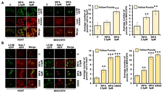 Withaferin A elevates the fusion of autophagosomes with lysosomes. (A) Huh7 and MHCC97H cells were transfected with GFP-LC3B encoding plasmid, treated with 5 µM of WFA or EBSS, followed by Lysotracker red staining. Representative fluorescence images are shown. Number of yellow puncta shown as bar graphs. ** p < 0.01, compared with control. (B) Huh7 and MHCC97H cells were co-transfected with GFP-LC3B and RFP-Rab7 followed by 5 μM WFA or EBSS treatment. Representative fluorescence images are shown here. Bar graphs show number of yellow puncta. ** p < 0.01, compared with control; *** p < 0.001, compared with control. Scale bar 10 μm.