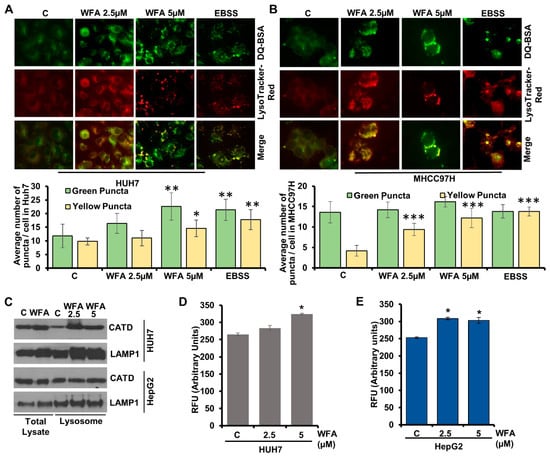 A culminating step that defines autophagic response, and also separates it from other cellular trafficking and degradation machineries, is the lysosomal degradation of the cargo cytoplasmic material [33]. To confirm that WFA induced lysosomal activity in HCC cells, we utilized the DQ-BSA (BSA derivative whose green fluorescence gets quenched excluding when it is cleaved by proteolytic enzyme) assay. HCC cells incubated with DQ-BSA and LysoTracker-Red showed dequenching of DQ-BSA (green fluorescence is retained) in lysosomes (exhibiting red fluorescence) upon WFA treatment showing colocalization of red and green fluorescence (merge as yellow), similar to EBSS-treated cells whereas DQ-BSA was quenched in vehicle-treated cells (Figure 5A,B). While multiple other cellular degradation processes degrade their substrates to short peptides, autophagic degradation via lysosomal proteases uniquely degrades the cargo in autophagolysosomes to their constituting amino acids, fueling the metabolic reactions or repair processes in the cell [33]. Cathepsin-D is one of the major lysosomal enzyme required for degrading cargo in autolysosomes [38], and to confirm the involvement of Cathepsin-D, we examined Cathepsin-D expression and activity, respectively. The lysosomal extract of WFA treated HCC cells showed increased Cathepsin-D level compared to the vehicle treated control cells (Figure 5C–E). An increase in expression and activity of Cathepsin-D along with DQ-BSA-dequenching, showed that WFA treated HCC cells undergo complete autophagic response.