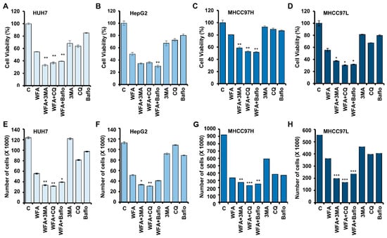 Withaferin A-mediated autophagy in HCC cells is cytoprotective in nature. (A–D) Cell viability of various HCC cells after treatment with 5 µM WFA alone and in combination with 4 mM of 3MA (3-Methyl adenine), 25 µM CQ or 200 nM bafilomycin, respectively. (E–H) HCC cells were treated with 5 µM WFA alone and in combination with 4 mM 3MA, 25 µM CQ and 200 nM bafilomycin, respectively, and subjected to trypan blue dye exclusion assay. * p < 0.05, compared with Withaferin A; ** p < 0.01, compared with WFA; *** p < 0.001, compared with Withaferin A.