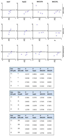 Synergistic interaction between Withaferin A and autophagic inhibitors. Inhibitory effects of WFA combined with 3MA, Chloroquine (CQ) and bafilomycin, respectively, in various HCC cells. The CI value was calculated using the Chou-Talalay method. CI < 1, CI = 1 and CI > 1 indicates synergistic, additive and antagonistic effects, respectively.