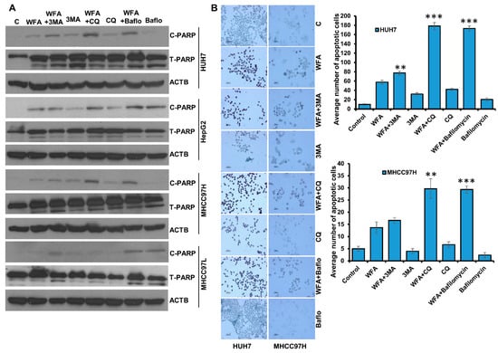 Combined treatment with Withaferin A and autophagic inhibitors induces apoptosis in HCC cells. (A) HCC cells were treated with 5 µM WFA alone and in combination of 4 mM 3MA, 25 µM CQ and 200 nM bafilomycin, respectively, total cellular lysates were prepared and subjected to western blot analysis to examine the expression level of Cleaved-PARP (C-PARP) and Total-PARP (T-PARP), respectively. ACTB served as the loading control. (B) Huh7 and MHCC97H were treated with 5 µM WFA alone or co-treated with 4 mM 3MA, 25 µM CQ and 200 nM bafilomycin, respectively, and subjected to TUNNEL assay following the manufacturer’s protocol. Images were captured microscopically at 100× (Huh7) and 50× (MHCC97H) magnification. Bar graphs show number of apoptotic cells. ** p < 0.01, compared with WFA; *** p < 0.001, compared with WFA, Scale bar, 100 μm.