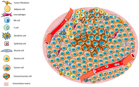 In solid tumors, the tumor mass is formed by a diverse milieu which is composed of malignant and nonmalignant cells such as endothelial cells, cancer-associated fibroblasts, immune cells, adipose cells, and neuroendocrine cells in addition to vascular and lymphatic networks and the extracellular matrix (ECM) [1]. This dynamic and complex multicellular environment is known as the tumor microenvironment (TME) (Figure 1). The TME has long been considered an important factor for tumor growth: The first publications are from the 19th century [18]! In the past few years, the TME and noncancerous cells have been recognized as major players for tumor growth [19,20] and, therefore, as potential targets for drug actions. However, due to its complexity, the TME and its cancer-type specific features still remain an obstacle for efficient cancer therapy [3]. Many of the molecular mechanisms of signaling pathways within the TME are not well-understood and the complex interactions between cellular and non-cellular TME components are not well-defined. A detailed understanding of the TME and its interactions would allow for better pharmacological treatment and a better tumor prognosis.