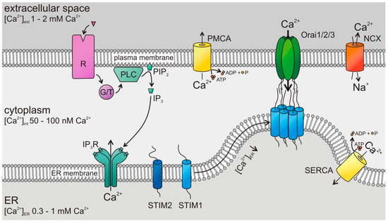 Store-operated Ca2+ entry (SOCE) by stromal-interaction molecule (STIM)/Orai channels in cancer cells: Following the stimulation of G protein- or tyrosine kinase-coupled (G/T) receptors (R), phospholipase C (PLC) hydrolyses phosphatidylinositol 4,5-bisphosphate (PIP2) to inositol trisphosphate (IP3). The latter binds to its receptor, a Ca2+ release channel in the endoplasmic reticulum (ER) membrane and opens it, which induces the Ca2+ depletion of ER Ca2+ stores. A drop of (Ca2+)ER activates luminal Ca2+ sensor proteins, the STIMs. Activated STIMs oligomerize and move to the plasma membrane where they bind and open Orai channels, leading to a Ca2+ influx across the plasma membrane. Plasma membrane Ca2+ ATPases (PMCAs), Na+–Ca2+ exchangers (NCX), and sarco-/endoplasmic reticulum Ca2+ ATPases (SERCAs) export Ca2+ from the cytosol.