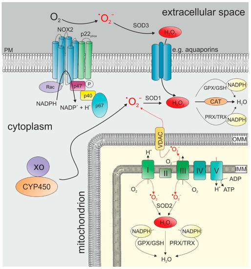 The main sources of ROS production and elimination: ROS can be generated either by activated NADPH oxidases (here represented by NOX2) located in the plasma membrane or by several complexes of the electron transport chain in the inner membrane of mitochondria. Other metabolic enzymes include xanthine oxidase (XO) and cytochrome P450 (CYP450) that directly form superoxide in the cytoplasm. Superoxide dismutases (SODs) can convert •O2¯ to H2O2. SOD1 is located in the cytoplasm, SOD2 is located in the mitochondrial matrix, and SOD3 is located in the extracellular space. The further elimination of H2O2 via catalase, GPX/GSH, and/or PRX/TRX can either be initiated directly in the mitochondrial matrix or in the cytoplasm upon the transport of H2O2 via aquaporins. CYP450: cytochrome P450; IMM: inner mitochondrial membrane; OMM: outer mitochrondrial membrane; PM: plasma membrane; VDAC: voltage-dependent anion channel; XO: xanthine oxidase.
