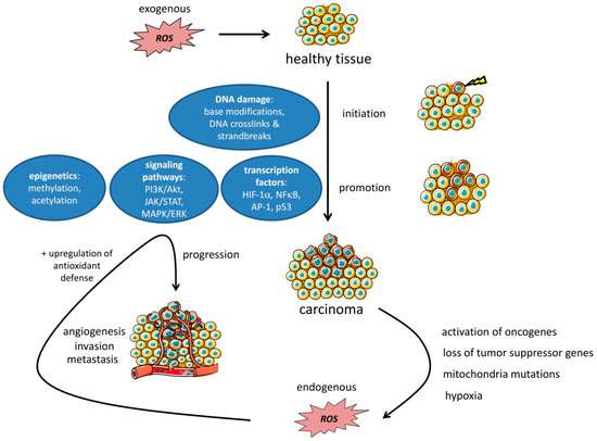 The first step of carcinogenesis is called initiation and refers to the alteration, change, or mutation of genes that develop either spontaneously or due to an exogenous source [17]. ROS can induce detrimental DNA damage via base modifications; inter-strand, intra-strand and DNA-protein crosslinks; and the induction of double strand breaks [151] (Figure 4). The promotion of cancer (cells) is considered a clonal expansion and accumulation of the pre-neoplastic cells that result from the initiation process, while progression already refers to a malignant conversion of the cells into invasive carcinoma [17,152]. Once tumors are initiated, there are several ways that ROS can drive promotion and expansion. These can be roughly divided into 3 subgroups: the impairment of transcription factors, signaling pathways, and epigenetics (Figure 4). We discuss the mechanisms most frequently involved in the majority of cancer subtypes but cannot acknowledge every mechanism in-depth.