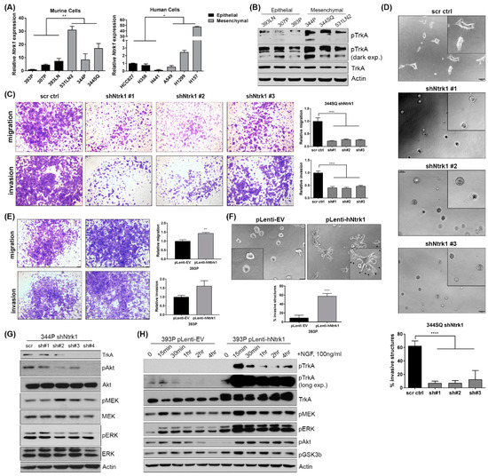 2.4. Baseline Expression of Ntrk1 Is Higher in Mesenchymal Murine and Human Lung Cancer Cell Lines and Is Necessary for Invasion and Migration