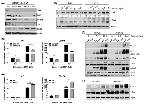 Ntrk1 can regulate JAK/STAT signaling to promote expression of PD-L1. (A) Western blot analysis of 344SQ Ntrk1 knockdown cells probing for phospho-Jak1 and phospho-Stat3. Actin was used as a loading control. (B) Western blot analysis of 393P and 344P cell lines stimulated with NGF at 100ng/ml over a short time course to assay activation of phospho-Jak1 and phospho-TrkA. Densitometry calculations of phospho-Jak1 intensity relative to actin were normalized to 393P (-) and are shown below the phospho-Jak1 blot. (C) Real-time qPCR analysis of CD274 (PD-L1) expression in 344P Ntrk1 knockdown cells when co-cultured with total splenocytes. (D) 393P Ntrk1 overexpression cells were co-cultured with total splenocytes and assayed using qPCR for expression of CD274. (E) 393P Ntrk1 overexpression cells were cultured alone (0:1) or co-cultured with total splenocytes at 5:1 and 20:1 ratios. Either DMSO control or LOXO-101, a pan Trk-inhibitor, were added to the co-culture at the time of seeding. After 3 days, tumor cells were assayed for protein expression of PD-L1, phospho-TrkA, and phospho-Jak1. (F) Western blot analysis of PD-L1 expression in 393P empty vector (EV) control and Ntrk1 overexpression tumors.