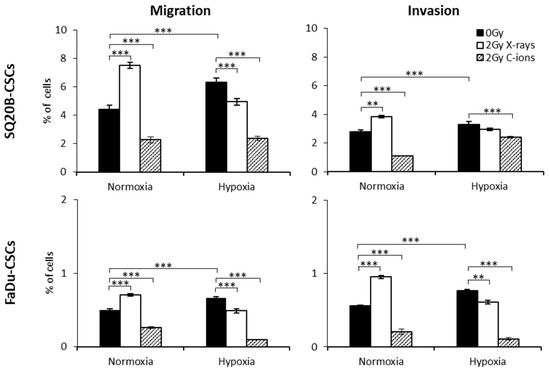 2.3. Consequences of X-ray or C-ion Irradiation on Cell Migration and Invasion under Normoxia or Chronic Hypoxia