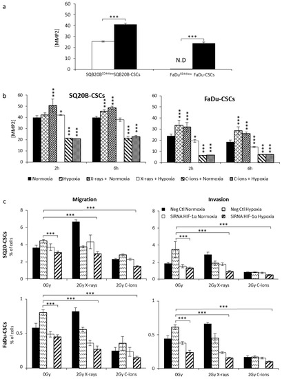 - Wozny, A.-S.; Lauret, A.; Battiston-Montagne, P.; Guy, J.-B.; Beuve, M.; Cunha, M.; Saintigny, Y.; Blond, E.; Magne, N.; Lalle, P.; et al. Differential pattern of HIF-1α expression in HNSCC cancer stem cells after carbon ion or photon irradiation: One molecular explanation of the oxygen effect. Br. J. Cancer 2017, 116, 1340–1349. [Google Scholar] [CrossRef]