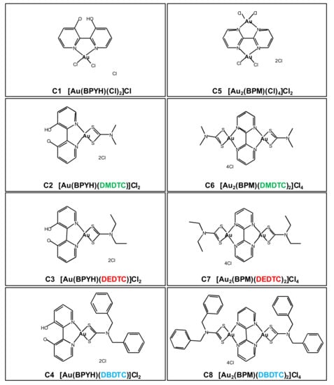 The expected structures of eight new gold (III) compounds (C1–C8) are shown in Figure 1. Four molecules (compounds C1–C4) have a 2,2′-bipyridine-3,3′-diol (BPYH) moiety and a single gold atom, while the others (compounds C5‒C8) have a 2,2′-bipyrimidine (BPM) moiety and two gold atoms. Compounds C2 and C6 are dimethyldithiocarbamates, C3 and C7 are diethyldithiocarbamates, and C4 and C8 are dibenzyldithiocarbamates. The gold (III) complexes had >99% purity and interacted with lysozyme, tryptophan, and guanine (Supplementary Materials, Figures S1–S10 and Tables S1–S3).