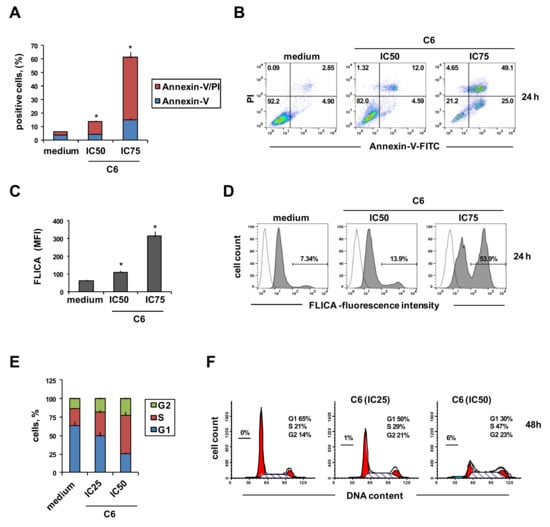 C6 was chosen for further analyses with the PC3 prostate cancer cell line. When PC3 cells were incubated with C6 at IC50 (0.62 µM) and IC75 (1.85 µM), there was a dose-dependent increase in the percentage of annexin-V-positive cells, indicating early apoptosis, and also of double stained annexin-V- and propidium iodide (PI)-positive cells, indicating late apoptosis (Figure 2A,B). Consistently, treatment with C6 activated caspase 3,7, evaluated using fluorochrome-labeled inhibitors of caspases (FLICA) that irreversibly bind active caspase (Figure 2C,D). These results suggest that apoptosis is involved in tumor cell death by C6. Finally, treatment of PC3 cells with C6 modified the distribution of cells in the cell cycle, by increasing the percentage of cells in S phase and decreasing that in G1 compared to untreated cells (Figure 2E,F).