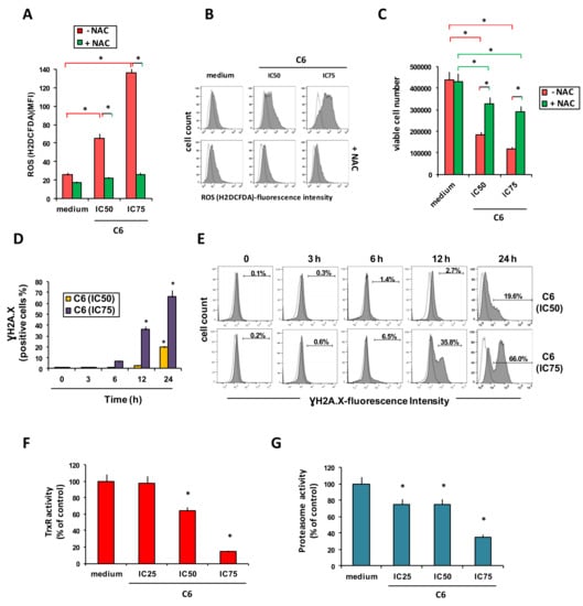 Compound C6 increases ROS generation induces double-stranded DNA breaks and reduces thioredoxin reductase and 20 S proteasome activities. PC3 cells were cultured in complete medium alone or with compound C6, at the half-maximal inhibitory concentration (IC50), at IC25, or IC75. (A,B) Reactive oxygen species (ROS) generation by PC3 cells exposed to C6 at IC50 and IC75 for 24 h, in the presence or absence of the ROS scavenger N-acetyl cysteine (NAC) (added 30 min before drug treatment). ROS were detected using H2DCFDA. (A) Generated ROS levels (mean fluorescence intensity, MFI). (B) Representative flow cytometry histograms of generated ROS. (C) Number of viable cells 24 h after treatment with C6 and NAC (NAC, added 30 minutes before drug treatment), evaluated using trypan blue dye exclusion. (D,E) Histone H2A.X phosphorylation (γH2A.X) as a measure of double-stranded DNA breaks, detected with FITC anti-H2A.X Phospho (Ser139) antibody. (D) Time course of phosphorylation at two concentrations of C6. (E) Representative flow cytometry histograms of γH2A.X. (F) Thioredoxin reductase (TrxR) activity after a 12 h treatment with C6, normalized to control (medium). (G) Proteasome activity after a 12 h treatment with C6, evaluated with the 20S-Proteasome Assay kit, normalized to control (medium). All bar charts report means and SD of three independent experiments. Statistical analysis was performed using one-way ANOVA, followed by Turkey’s or Dunnett’s multiple comparisons test where appropriate. * p < 0.05 vs. medium, unless otherwise indicated.