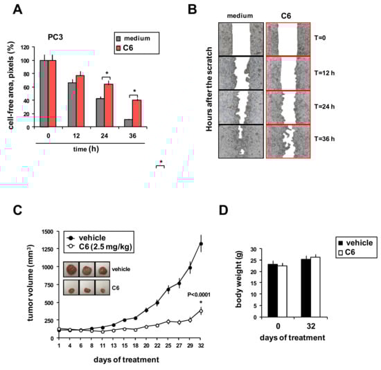 The effect of C6 on PC3 cell migration was evaluated using the in vitro scratch assay. A 3 h pretreatment slowed the ability of PC3 cells to refill an empty area (“scratch”) of the monolayer compared to untreated cells: 36 h after the monolayer was scratched, the remaining uncovered area was about 40% in C6-pretreated cells and about 10% in control cells (Figure 4A,B). Finally, we examined the effects of C6 on the in vivo growth of PC3 cell xenografts in female athymic nude mice. Inhibition of tumor growth became apparent starting 15 days after the beginning of treatment, compared to animals not treated with C6 (Figure 4C). By day 32, control tumors had grown to a mean volume of 1327 mm3 (SD = 105 mm3) whereas C6-treated tumors reached 385 mm3 (SD = 35 mm3), reflecting a 71% inhibitory effect (Figure 4C). This difference was significant (p < 0.0001, Student’s t test). C6 treatment did not affect the weight of the animals (Figure 4D).