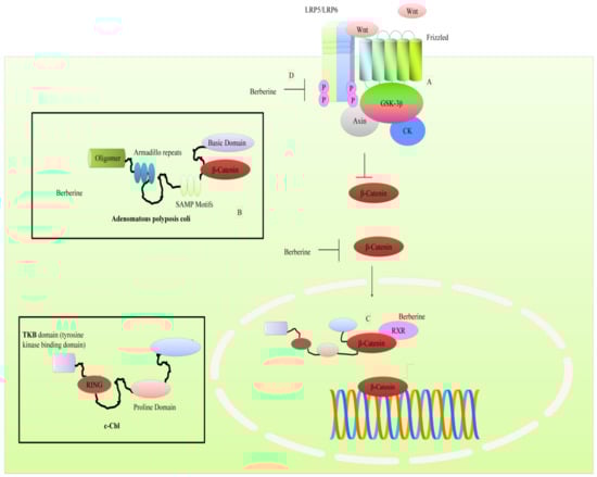 - Ruan, H.; Zhan, Y.Y.; Hou, J.; Xu, B.; Chen, B.; Tian, Y.; Wu, D.; Zhao, Y.; Zhang, Y.; Chen, X.; et al. Berberine binds RXRα to suppress β-catenin signaling in colon cancer cells. Oncogene 2017, 36, 6906–6918. [Google Scholar] [CrossRef] [PubMed]