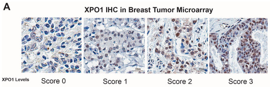 For the verification of XPO-1 protein levels in patient tumor samples, BRC1021 tissue microarray from Pantomics, Inc. (Richmond, CA, USA) containing 95 cases with known ER, PR, AR, Her2, p53, EGFR, and Ki67 IHC results was used. Subtype of tumors were based on following criteria: Lum A: ER (+), Her2 (−), Ki67 < 15; Lum B: ER (+), Her2 (+) or ER (+), Her2 (−), Ki67 > 15; Her2 (+): ER (−), Her2 (+); TNBC: ER (−), PR (−), Her2 (−) [37,38]. XPO1 antibody was from Bethyl laboratories (A300-469A). BRC1021 TMA included 43 Her2, 3 LumA, 31 Lum B, 17 TNBC tumor samples. UTSW cohort included 50 Luminal A, 45 Luminal B, 48 TNBC and 35 Her2 positive/amplified breast tumors validated by a pathologist. The samples were collected under the STU 102010-051 IRB protocol number, were collected at UTSW, and affiliated hospitals. For each core, a score for XPO1 was assigned based on the signal intensity (0 = none, 1 = low, 2 = moderate, and 3 = high).