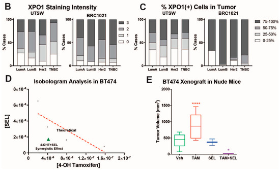Our previous study showed that XPO1 mRNA was overexpressed in the Luminal B subtype of tumors, which are more likely to recur on endocrine treatments relative to the Luminal A subtype [11]. To validate our results, we performed IHC analysis for XPO1 protein expression in two independent breast tumor sets with samples from various breast cancer subtypes. This analysis showed that Luminal B subtype tumors have higher overall XPO1 signal intensity and percentage XPO1 positive cells in two independent cohorts of breast tumors (Figure 1A,B). We then treated endocrine resistant BT474 cells with 4-OHT, SEL or both in combination to assess whether these treatments synergized to reduce cell viability. The isobologram analysis showed that the 4-OHT and SEL combination synergized to achieve a greater decrease in cell viability than with either agent alone (Figure 1D). These results are consistent with our BT474 xenograft studies in nude mice, which showed that the tamoxifen (TAM) and SEL combination provided complete tumor regression, which was sustained several weeks after cessation of drug administration (Figure 1E) [11].