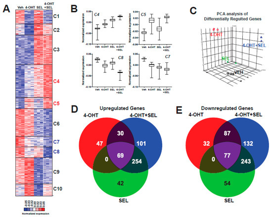 To understand how the TAM+SEL combination provide a sustained tumor regression, we performed a global gene expression analysis in BT474 cells that were treated with Veh, 4-OHT, SEL or 4-OHT+SEL. Hierarchical clustering of the differentially-expressed genes revealed 10 clusters with different gene regulation patterns. Genes in Clusters 1, 2, 3, 6, 9 and 10 were regulated similarly with all treatments. The 4-OHT+SEL combination and 4-OHT alone resulted in similar patterns of regulation for genes in Cluster 1. The 4-OHT+SEL combination and SEL alone caused similar gene regulation patterns for genes in Clusters 2, 3, 6, 9 and 10. On the other hand, Clusters 4 and 5 include genes that were upregulated more with the combination treatment than either treatment alone, and genes in Clusters 7 and 8 were downregulated more with the combination treatment than either treatment alone (Figure 2A,B). Principle component analysis (PCA) showed that treatment groups differed significantly (Figure 2C). Venn-diagram analysis of up- and down-regulated genes revealed that the combination treatment caused gene expression changes similar to as well as different from single agent treatments. The combination treatment increased the expression of 101 genes and decreased the expression of 132 genes that were not affected by either treatment alone (Figure 2D,E).