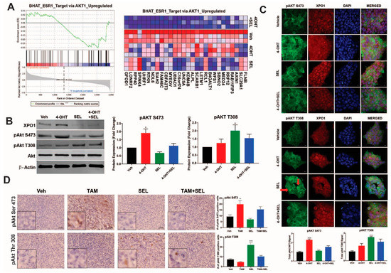 XPO1 inhibition modulates differential Akt phosphorylation in TAM-resistant cells and tumor xenografts. (A) GSEA analysis of RNA-Seq data depicting regulation of Akt signaling by the 4-OHT+SEL combination. ERα-XPO1 targeting changed XPO1 and pAkt protein expressions in both TAM-sensitive and TAM-resistant breast cancer cell lines. Western blot analysis (B) and immunofluorescence analysis (* p < 0.05) (C) of BT474 cells treated with 4-OHT (10−6 M) and SEL (10−7 M) for 24 h alone and in combination. Protein expression was quantified and is shown in bar graphs. A one-way analysis of variance (ANOVA) model was used for statistical significance of treatment effect and values were presented as mean ± SEM from three independent experiments (* p < 0.05, ** p < 0.01). scale bar = 200 pixels. (D) IHC staining of pAkt T308 and pAkt S473 in tumor samples obtained from BT474 xenografts received individual and combined TAM and SEL treatments (from Figure 1C). In the figure, red-brownish staining represents pAkt T308 and pAkt S473 proteins. This figure showed that individual 4-OHT and SEL treatments activated two different phosphorylation sites of Akt protein. The top panel indicated that SEL treatment activated pAkt T308 phosphorylation in BT474 tumor xenografts. The bottom panel showed that TAM treatment activated pAkt S473 phosphorylation in BT474 tumor xenografts. Quantification of positive staining was performed digitally by selecting four independent regions on the sample slides and the results were given in the corresponding graphs. Statistical significance was presented as mean ± SEM by using one-way analysis of variance (ANOVA) model (** p < 0.01, **** p < 0.0001). scale bar = 20 µm.
