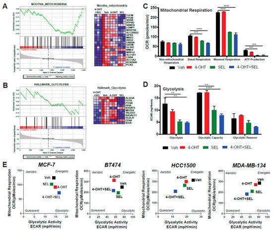 ERα-XPO1 targeting changes the metabolic phenotype of breast cancer cells from an energetic to a quiescent profile. GSEA analysis of RNA-Seq data depicting the regulation of glycolytic (A) and mitochondrial respiration (B) pathways by the 4-OHT+SEL combination. ERα-XPO1 targeting decreased the glycolytic activity of BT474 cells. Glycolytic functions were determined by the glycolysis stress test. A two-way analysis of variance (ANOVA) model was used for statistical significance of drug treatments alone or in combination and values were presented as mean ± SEM from two independent experiments and all experiments were performed in triplicates. (* p < 0.05, ** p < 0.01, *** p < 0.001, **** p < 0.0001). (C,D) ERα-XPO1 targeting decreased the mitochondrial activity of BT474 cells. Mitochondrial activity parameters were measured by the mitochondrial stress test. A two-way analysis of variance (ANOVA) model was used for statistical significance calculations and values were presented as mean ± SEM from three independent experiments (* p < 0.05, ** p < 0.01, *** p < 0.001, **** p < 0.0001). Some key parameters of mitochondrial function (Basal respiration, proton leak, maximal respiration, spare respiratory capacity, non-mitochondrial respiration, ATP production, coupling efficiency and spare respiratory capacity) were calculated and presented for each treatment conditions. (E) Cell phenotype assay resulted in MCF-7, BT474, MDA-MB-134 and HCC1500 cells, which were treated with 4-OHT (10−6 M) and SEL (10−7) M for 24 h alone, for 24 h alone and in combination. Changes in metabolic profile was determined by measuring oxygen consumption rate (OCR) and extracellular acidification rate (ECAR) under basal and stressed conditions with the cell phenotype assay. Values are presented as ± SEM from three independent experiments.