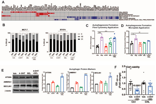 Our gene expression analyses indicated that gene sets associated with cell cycle and regulation of epithelial cell proliferation were downregulated, whereas gene sets associated with autophagy and cell death were upregulated (Figure 5A). To validate these results, we performed cell cycle analysis in MCF-7 cells and BT474 cells treated with Veh, 4-OHT, SEL or the 4-OHT+SEL combination. The combination treatment was very effective, particularly in BT474 cells, in reducing ratio of S-phase cells (Figure 5B). We also validated autophagic vacuole formation (Figure 5C,D) and an increase in autophagy related proteins in this cell line (Figure 5E). In addition, we examined different apoptotic caspase activities, PARP cleavage and changes in apoptotic cells in both cell lines. We did not observe any indicator of apoptosis in either of the cell lines at up to 120 h of treatment (Supplementary Figure S3). Finally, treatment of BT474 cells with the autophagy inhibitor chloroquine blocked the 4-OHT+SEL mediated reduction in cell viability (Figure 5F). Together, these results reveal that co-inhibition of ERα-XPO1 leads to autophagic cell death.