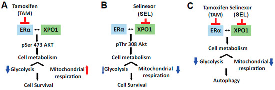To evaluate the effects of combining TAM (4-OHT) with SEL, in the present study we used transcriptome analysis and found that the combination differentially modulated Akt signaling-associated gene expression as well as glycolytic and mitochondrial gene expression programs. Because of differential changes in Akt phosphorylation with 4-OHT and/or SEL, we hypothesized that metabolic pathways associated with Akt activity and consequently the metabolic profile of breast cancer cells would change in the presence of 4-OHT and SEL. We demonstrated that combined targeting of XPO1 and ERα in TAM-resistant cell lines shuts down metabolic pathways that would eventually lead to autophagy. Our studies provide a novel mechanism of action of combined targeting of ERα and XPO1 to overcome TAM resistance in recurrent ERα (+) breast cancer.