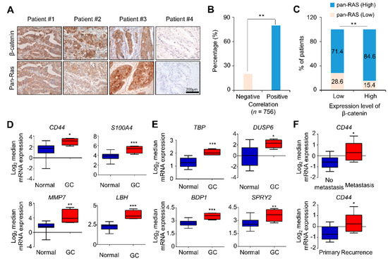 The clinical relevance of the activation of the two pathways in GC was further investigated by analyzing the expression patterns of target genes of the two pathways in tissues of GC patients from the database sets (DErrico and Forster Gastric statistics; https://www.oncomine.org). The expression of the Wnt/β-catenin pathway target genes, particularly those related to cancer, such as CD44, S100A4, MMP7, and LBH, was significantly increased in GC tumors compared with that in normal tissue (Figure 1D). The mRNA expressions of TBP, DUSP6, BPD1, and SPRY2 genes, representative RAS target genes [26], were also elevated in the same database set (Figure 1E). Moreover, the CSC marker CD44, a target gene of Wnt/β-catenin pathway, was significantly induced in the tissues of GC patients, especially those who underwent metastasis and recurrence (Figure 1F).