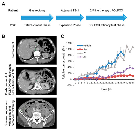 The poor clinical outcome of GC patient, and the heterogeneous response of patient-derived xenograft (PDX) tumors to 5-fluorouracil and oxaliplatin modulated with leucovorin (FOLFOX). (A) Establishment and treatment of PDX tumors simultaneously with the clinical course of the patient. After gastrectomy, the primary tumor of the patient was engrafted into nude mice and allowed to expand for a FOLFOX-efficacy test. The patient in whom the adjuvant TS-1 chemotherapy has failed was administered into second-line therapy with FOLFOX accompanied by PDX. (B) CT images taken during the clinical course of the patient. The recurrent tumors (upper panel, arrow) showed a reduction in size after FOLFOX chemotherapy (middle panel, arrow). Subsequently, the peritoneal metastasis (lower panel, left arrow) grew, and ascites (lower panel, right arrow) developed. Tumor-bearing immunodeficient mice (n = 8 vehicle and n = 9 FOLFOX mice in each treatment group) were treated when the tumor had reached a volume of 100–200 mm3. FOLFOX (5-fluorouracil at 15 mg/kg and oxaliplatin at 5 mg/kg) was administered as described in the Methods section. (C) The reanalyzed tumor growth kinetics (n = 9 vehicle, n = 3 Res, n = 3 PR and n = 2 AR) from the FOLFOX-treatment experiment (Figure S3a).
