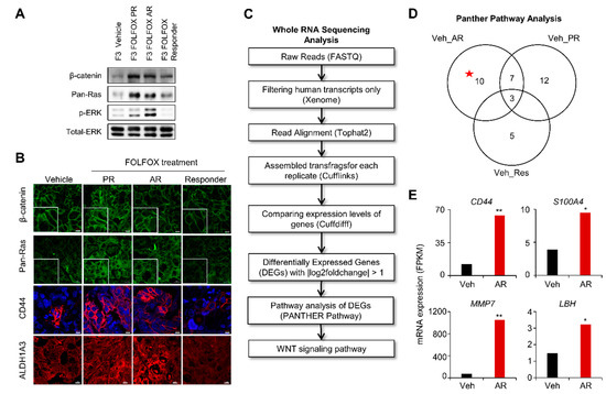 To gain insight into the mechanisms underlying the observed phenotype transitions, we analyzed and compared the transcriptomes between vehicle- and FOLFOX-treated groups. RNA sequencing was performed, followed by data analyses using PANTHER (Protein ANalysis THrough Evolutionary Relationships, http://pantherdb.org) 10.0 pathway annotation [28] (workflow outlined in Figure 3C). Through the statistical overrepresentation test in the PANTHER pathway analysis [29], the Wnt/β-catenin pathway was found to be an actionable therapeutic target of the 10 exclusively enriched signaling pathways with statistical significance in “vehicle versus AR” (Figure 3D, Figure S4). The role of Wnt/β-catenin signaling in the activation of CSCs and chemotherapy resistance was evidenced by increased fragments per kilobase of transcript per million mapped reads (FPKM) [30] values of CD44, S100A4, MMP7, and LBH genes in FOLFOX AR-PDX tumors (Figure 3E).