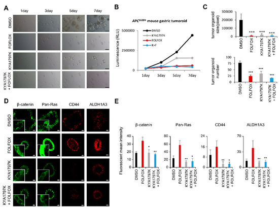 A potential contribution of chemotherapy to the activation of CSCs was shown by the enrichment of CD44 and ALDH1A3 in the tumoroids derived from gastric tumor tissues from Apc1638N mice, which reduced their size upon FOLFOX treatment. The CSC induction by FOLFOX treatment indicates that the recurrence of tumors after initial response to FOLFOX treatment may be related to the activation of CSCs. Although both FOLFOX and KYA1797K similarly suppressed the growth of tumoroids, KYA1797K, which degrades β-catenin and RAS proteins, suppressed CSC activation of the tumoroids. Moreover, the induction of CSC markers by FOLFOX did not occur in the tumoroids co-treated with KYA1797K and FOLFOX.